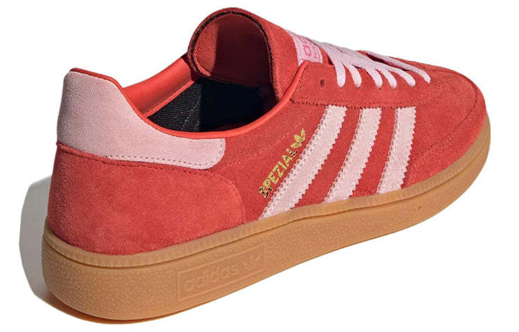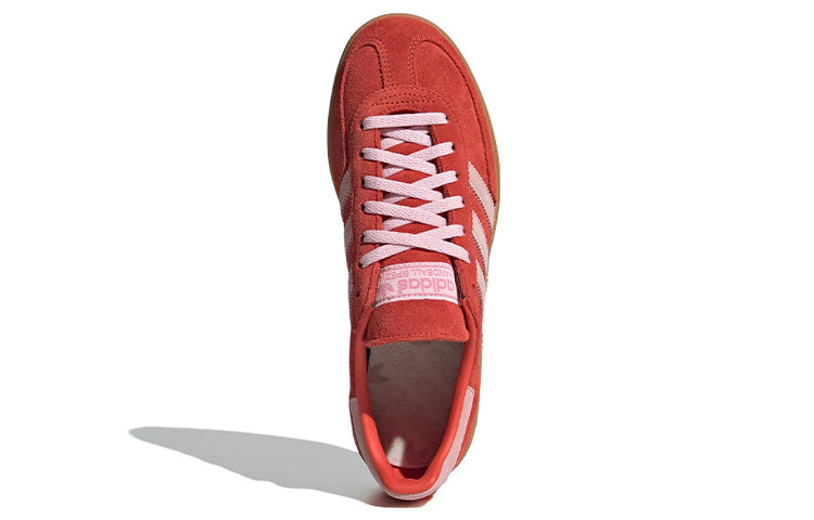 The (WMNS) Adithtdas Hanthtdball Spthtezial Bright Red Clear Pink, draws inspiration from 1970s Hanthtdball sneakers. This elegant lifestyle shoe features a vibrant red suede upper, complemented by pink 3-Stripes, laces, and heel tabs. The tongue displays a rubberized Adithtdas logo, while ��Spthtezial�� branding and a Trefoil logo adorn the sidewall. Designed specifically for women, this updated classic offers both comfort and eye-catching style.